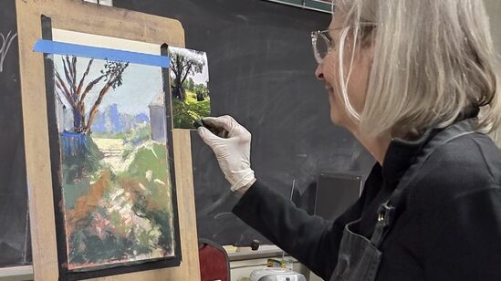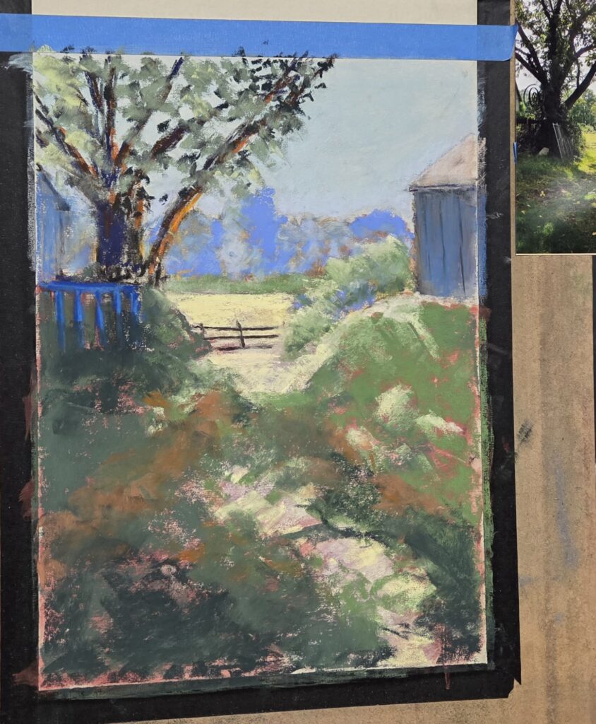 Pastel artist Susan Bosworth was the demonstrator at the Wethersfield Art League’s April monthly meeting. Susan’s subject matter, a bucolic donkey pasture minus the donkeys, emerged starting with a pastel underpainting followed by an application of rubbing alcohol which fixed the pigment on selected portions of the composition. She completed the delightful work in her style of expressionistic realism